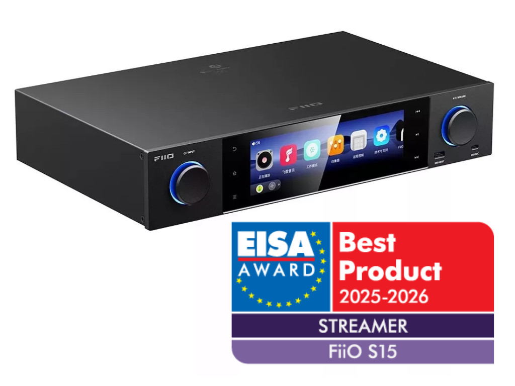 EISA DÍJ: "A hordozható és asztali eszközeiről ismert FiiO ezúttal a nagyobb streamer kategóriába is belépett – méghozzá lenyűgöző módon. Az Android-alapú rendszer az AKM zászlóshajó DAC-fokozatát használja, a hangzás részletgazdag és természetes. A 7,84 hüvelykes érintőkijelző, vagy a társalkalmazás segítségével az S15 többféle üzemmódot kínál: pl. Pure Music vagy USB DAC. A HDMI eARC, illetve a HDMI bemenet lehetővé teszi házimozi integrációját, a sokféle digitális és analóg kimenet révén a készülék bármilyen hifi rendszerbe könnyen beilleszthető. Ritka az ilyen sokoldalú streamer!"