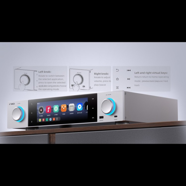 Az S15 fekvő kijelzője 7.84-inch-es. A 400*1280 felbontású érintőképernyőn keresztül kényelmesen hozzáférsz az Android 12-es operációs rendszerre telepített appokhoz és a beállításokhoz, pl. a 10 sávos, szabadon konfigurálható parametrikus EQ-hoz (PEQ). A nyitott rendszer lehetővé teszi további appok telepítését. A FiiO S15 lejátszón előtelepítve érkezik a speciálisan az S15-höz személyre szabott, fekvő elrendezésű FiiO Music app, amely igyekszik minden lejátszással kapcsolatos igényt kielégíteni. A Tidal, Deezer, Spotify, Youtube és az egyéb streaming klienseket egyszerűen telepítheted az S15-re.
