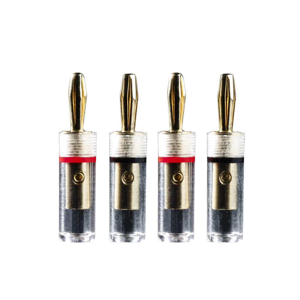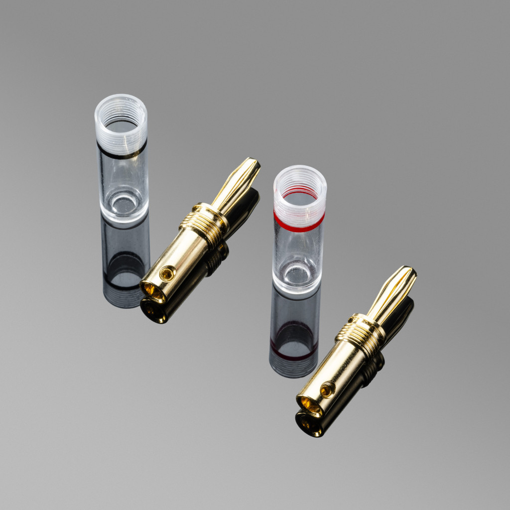 Az új, tetszetős LS E banándugók aranyozott fémdugók, átlátszó műanyag házzal. Az aranyozott felület tökéletes elektromos vezetőképességet biztosít. Csatlakoztassa az LS E semleges és homogén hangvisszaadást kínál kellemes magas hangokkal.