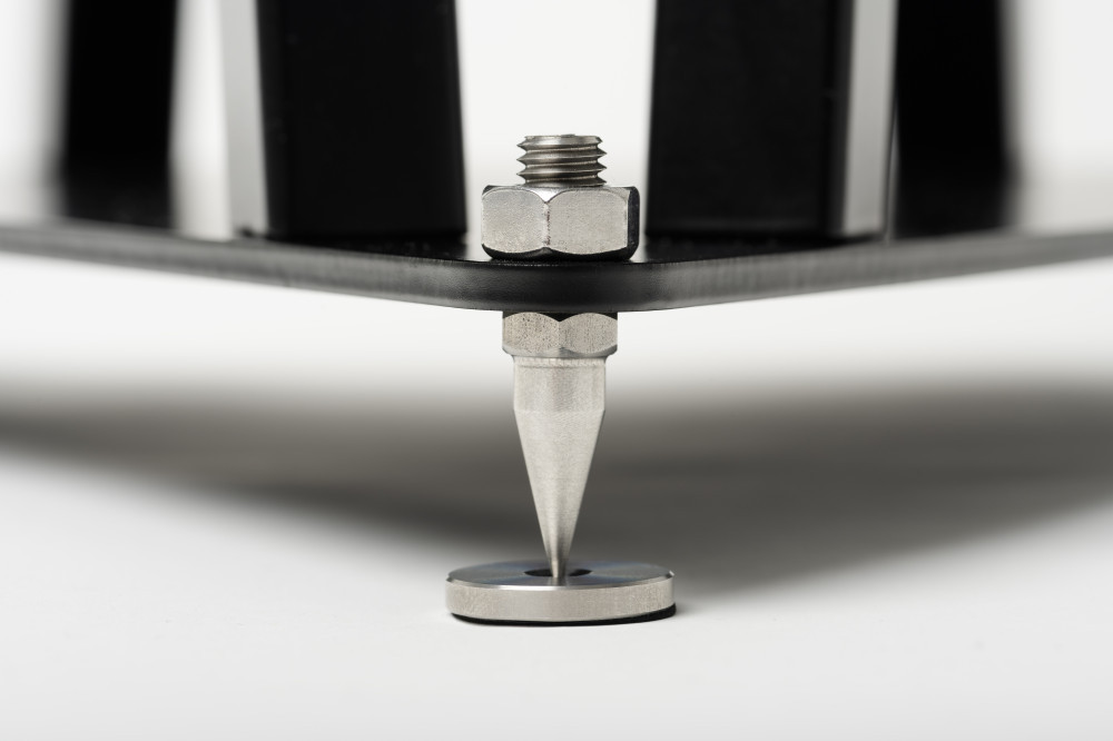 A felső lemezen lévő tüskéket is kínálunk Önnek, hogy elhelyezhesse a hangszóróját. A tüskéket úgy tervezték, hogy csökkentsék az érintkezést területet, hogy minimálisra csökkentsék a rezgési interferenciát, ami lehetővé teszi a a hangszóró rezgése az állványon keresztül kerüljön elvezetésre. a padlóba. Ezen rezgések minimalizálásával a basszus válasz tisztábbá válik, és jobban kontrolláltnak érződik. Emellett segít a finom részletek felszínre hozásában is, ami továbbá javítja a sztereó képet. Ha nem szeretné, hogy a hangszórókat a tüskékre helyezni, kínálunk még mikroporózus gumipárnákat kínálunk alternatívaként.