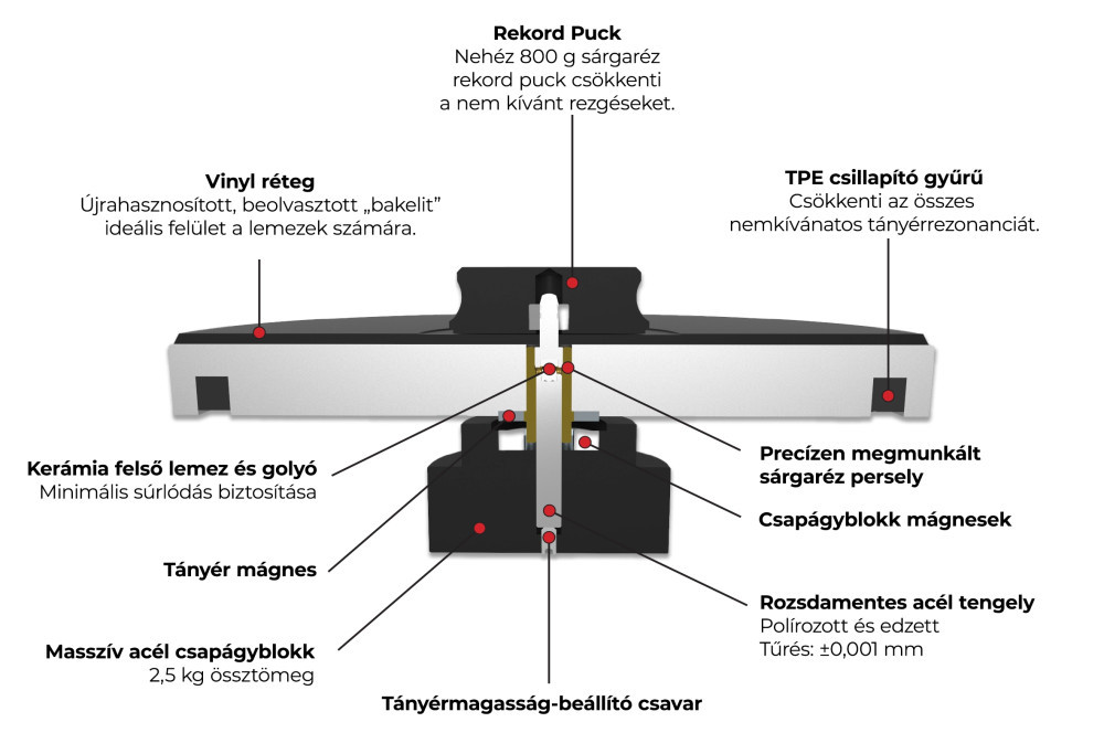 A stabil sebesség biztosításához megfelelő tányércsapágyra van szükség. Az Xtension 9 Evolution erre a célre különleges technológiát használ. A nagy súlyú tányér egy mágneses alátámasztással ellátott, fordított kerámia golyóscsapágyon forog, hogy a csapágyzaj és a rezonancia a lehető legkisebbre csökkenjen. Ezzel a megoldással képesek vagyunk tehermentesíteni a főcsapágyat, és biztosítani, hogy a tányér ultra-csendesen forogjon.