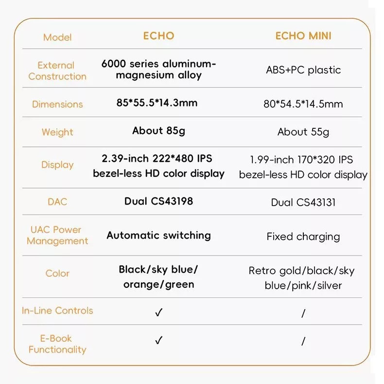 Legyen szó DSD, WAV, FLAC, APE, MP3, M4A vagy OGG fájlokról, az ECHO gyakorlatilag bármilyen audió formátummal vagy minőségi szinttel könnyedén megbirkózik. Akár DSD256 vagy 24 bites/192 kHz-es PCM felvételeket is hallgathatsz rajta.